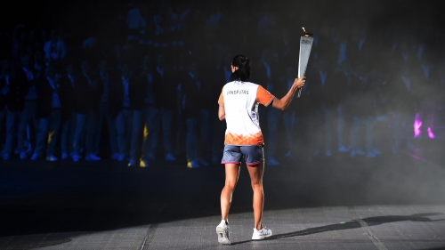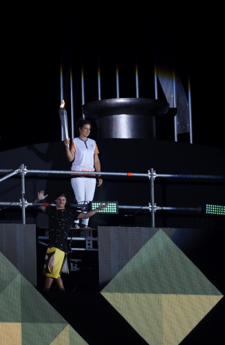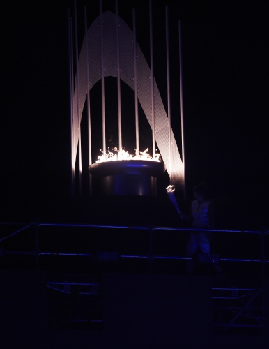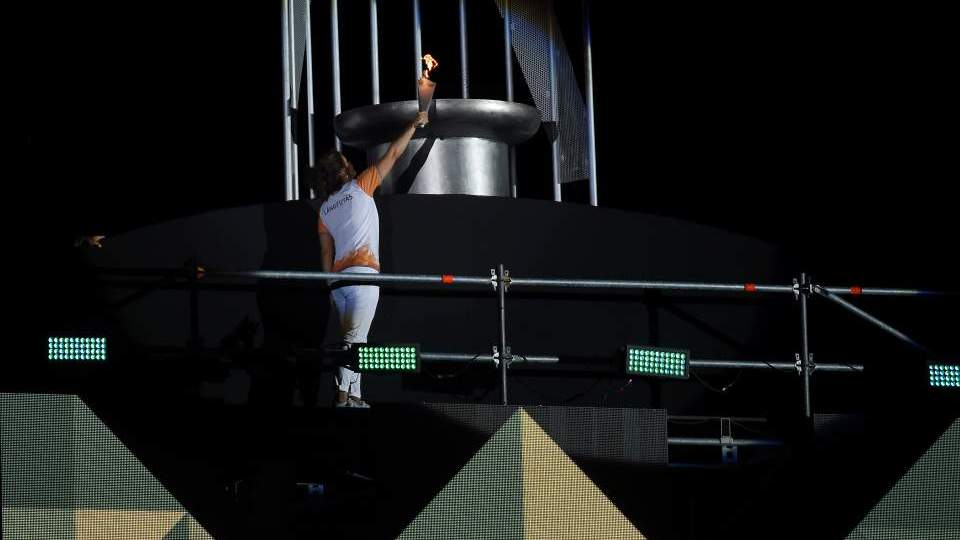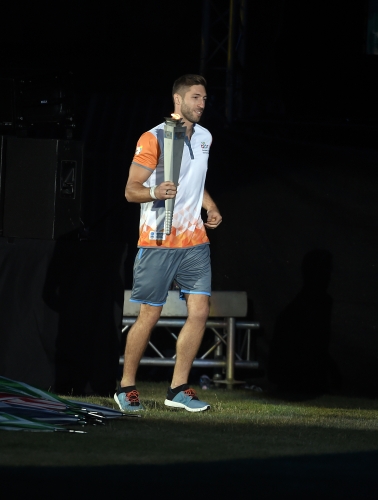 Egy rövid film segítségével követhettük nyomon az EYOF-láng útját, amellyel már a megnyitó helyszíne felé is neves sportolók futottak, míg megérkezett a stadionba. A jelen nagy alakjai, Berki Krisztián olimpiai bajnok tornász, Keglovich László olimpiai bajnok labdarúgó, Görbicz Anita háromszoros BL-győztes kézilabdázó, Palotai Károly olimpiai bajnok labdarúgó, Kammerer Zoltán háromszoros olimpiai bajnok kajakos, kézről kézre adta a fáklyát, míg végezetül a színpadon elhelyezett hatalmas Győr felirat ipszilonjában Egerszegi Krisztina ötszörös olimpiai bajnok úszó gyújtotta meg az EYOF-lángot.