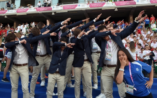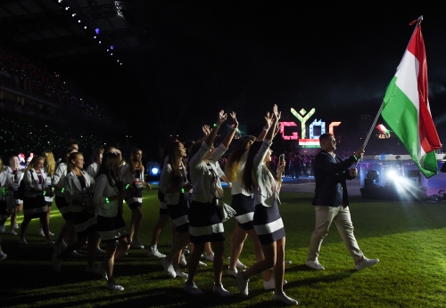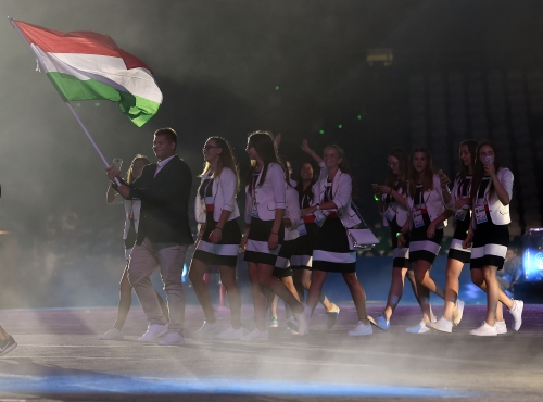 Az est egyik legjobban várt pillanata, a sportolók bevonulása következett. Számukra is különleges élmény lehetett a győri nyitóünnepség, hiszen a csapatok nem a stadionon kívülről érkeztek a küzdőtérre, hanem a lelátón foglaltak helyet, így maguk is végig ott lehettek első olimpiai eseményük nyitányán. Ötven ország sportolóinak felvonulása önmagában is felemelő, amit tovább fokozott a karkötők által kivetített hatalmas nemzeti lobogók látványa.