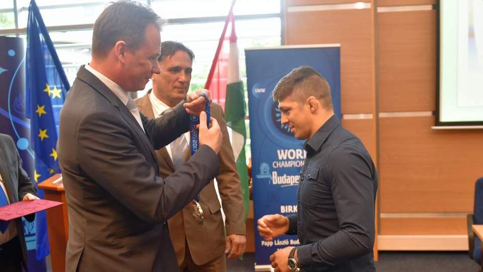 Kulcsár Krisztián Bacsa Péterrel, az MBSZ ügyvezető alelnökével átadta Lőrincz Tamásnak a 2017-es világbajnoki ezüstérmet. Az olimpiai 2., háromszoros Eb-győztes kiválóság eredetileg 3. lett tavaly Párizsban a kötöttfogású 77 kilósok között, de kiderült, hogy elődöntőbeli legyőzője, az orosz Alekszandr Cserhikin fennakadt a doppingvizsgálaton, így ő egy pozíciót előrelépett. A MOB elnöke az egyesületi rangsor élén végzők (ESMTK, Cegléd, Honvéd) képviselőit is köszöntötte.