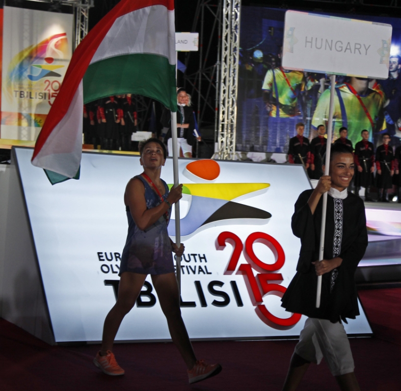 19:00. A magyar zászlót a tbiliszi EYOF négyszeres aranyérmese, egyszeres ezüstérmese, az úszó Késely Ajna vitte, aki teljesítményével az egész EYOF és a magyar csapat legeredményesebb sportolója lett.