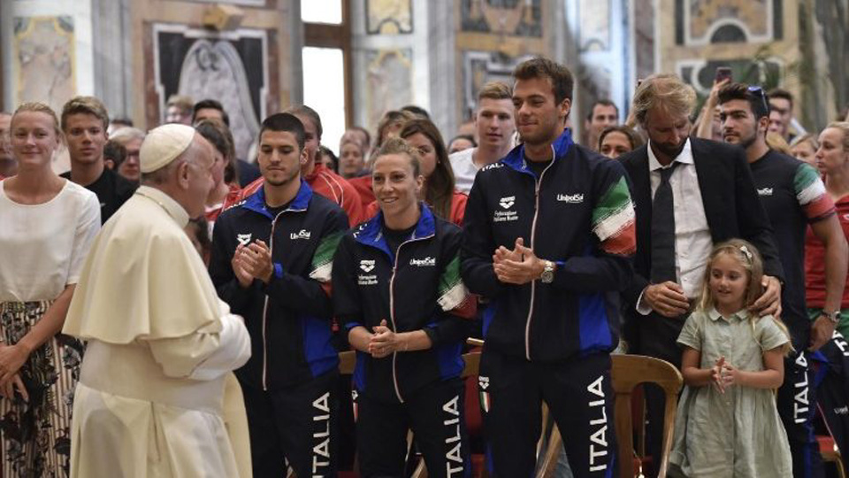 Ferenc pápa az úszókhoz szólván arról beszélt, hogy az időeredmények elérése mellett a sportolók helytállása elsősorban fegyelemről, egészséges versenyszellemről és csapatmunkáról tanúskodik. „Ti mindannyian demonstráljátok, hogy a célok elérhetők kemény edzésmunkával, amely szigorú elkötelezettséget és áldozatokat kíván. Mindez az élet egy nagyszerű leckéje, amely kifejezetten jó példa lehet a titeket követő fiatal generációk számára.”