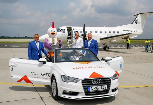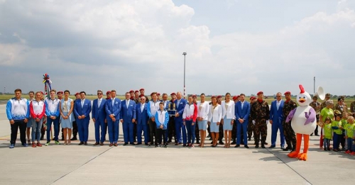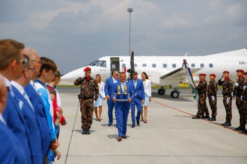 A láng fogadását a péri reptéren a győri 12. Arrabona Légvédelmi Rakétaezred díszszakasza és a Tata Helyőrségi Katonazenekar tette még ünnepélyesebbé. Borkai Zsolt polgármester mellett Berki Krisztián (torna), Görbicz Anita (kézilabda), Jakabos Zsuzsanna (úszás), Karakas Hedvig (dzsúdó), Pars Krisztián (atlétika), Laklóth Anna (kosárlabda) és Borissza Johanna Kitti (kerékpár) felnőtt, valamint Varga Bence (úszás), Pál Tamara (kézilabda), Lendvai Luca (atlétika), Füri Márton (kerékpár), Sipőcz Richárd (dzsúdó) és Mészáros Krisztofer (torna) fiatal sportági nagykövetek kísérték a lángot.