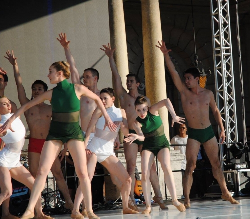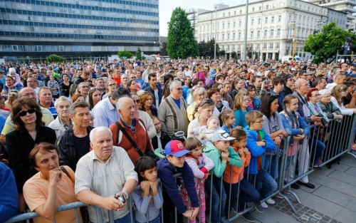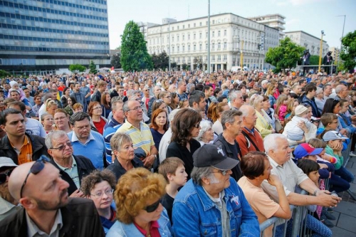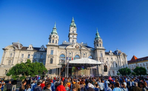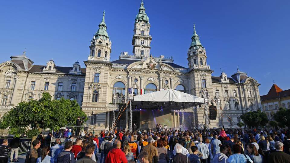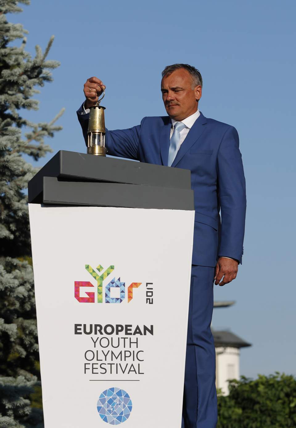 A lángfogadó műsorban Szalóki Ági és a Győri Balett közreműködött, az őrlángot pedig Borkai Zsolt helyezte el a Városháza téren felállított installáción. A ceremónia végén a The Biebers adta elő az EYOF hivatalos dalát, az ősbemutatót követően pedig az együttes egy fergeteges élő koncerttel ajándékozta meg a kilátogatókat.