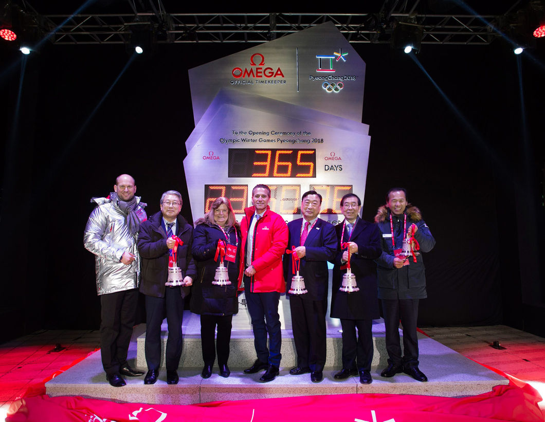 Kezdésként a Nemzetközi Olimpiai Bizottság (NOB) és az olimpiai mozgalom hivatalos időmérője, az Omega bemutatta visszaszámláló óráját. A szöuli városházán tartott ünnepségen ott volt többek között Gunilla Lindberg, a NOB Pjongcsangra kijelölt koordinációs bizottságának vezetője, Raynald Aeschlimann, az Omega ügyvezető elnöke, valamint Li Hi Pom, a POCOG elnöke. Az Omega 28. alkalommal készítette el visszaszámláló óráját az olimpiai játékokra, ezúttal egy különleges, télies dizájnnal, ami a pjongcsangi játékok elemeit is ötvözi.