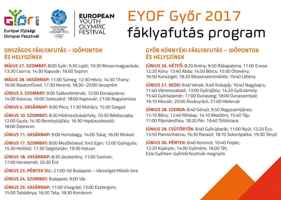 Szerda este érkezett Rómából Győrbe az Európai Ifjúsági Olimpiai Fesztivál lángja, május 27-én, szombaton pedig, már indul az országos fáklyafutás. A lángot délelőtt 8.45-től az önkormányzat képviselői és a 24 órás vetélkedőn részt vevő diákok búcsúztatják a Városház téren. Íme a teljes útvonal...