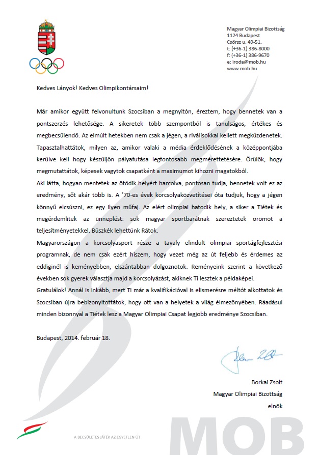 Borkai Zsolt, a Magyar Olimpiai Bizottság elnöke levélben gratulált a női rövidpályás gyorskorcsolyaváltónak a szocsi téli olimpián kedden elért hatodik, pontszerző helyhez.